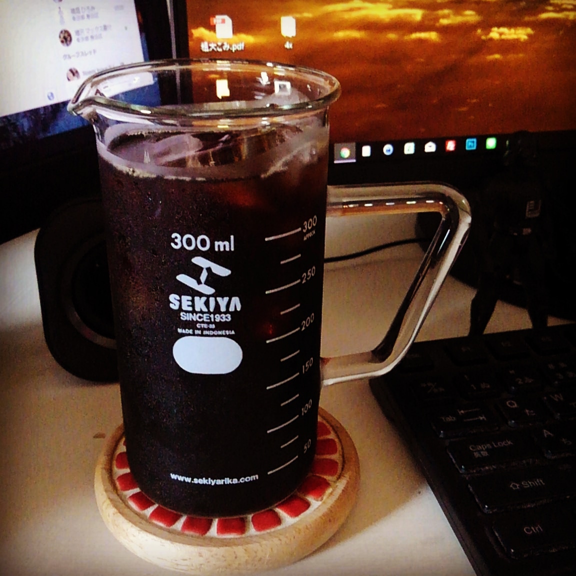 高いやつを買うw今日はミカドコーヒー。プレゼントでもらったビーカー型のコップで飲む。
